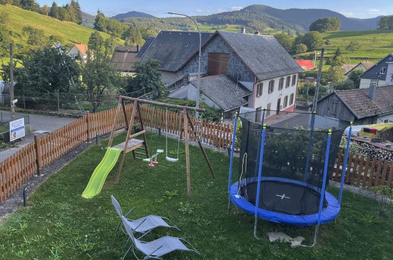 Notre grande terrasse orientée plein sud , offre une vue imprenable sur les montagnes environnantes. Vous avez également accès au jardin, équipé de relax et d’une petite balançoire pour les plus jeunes.