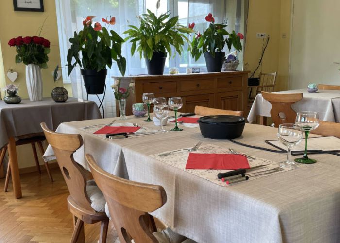 Nous préparons notre bouillon à base de vin d’Alsace et d’épices, et servons du coeur de rumsteak soigneusement choisi et finement émincé, accompagné de frites et de salade verte. Le repas se termine par de la glace ou du vacherin. La carte des boissons et des spiritueux est à votre disposition.